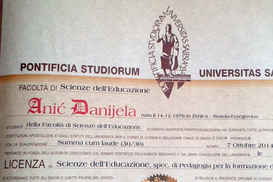 Od 2011. do 2014. godine pohađa poslijediplomski studij na Fakultetu odgojnih znanosti Papinskog sveučilišta Salesiana u Rimu i stječe licencijat iz pedagogije za formaciju zvanja.