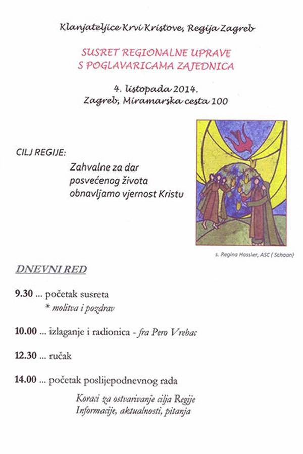 Članice Regionalne uprave predvođene regionalnom poglavaricom sestrom Ana Marijom Antolović susrele su se u subotu, 4. listopada 2014., s poglavaricama zajednica u samostanu Klanjateljica Krvi Kristove u Zagrebu, Miramarska cesta 100.