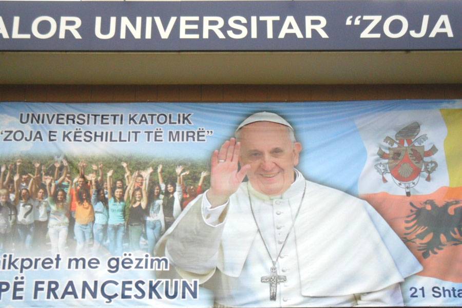 Tom prigodom papa je posjetio privatno Katoličko sveučilište Družbe Sinova Bezgrješne, „Naša Gospa dobrog savjeta“, kojemu je s ostalom subraćom i suradnicima, postavio temelje p. Mariano Passerini, koji sada djeluje u Kutini. Na tom sveučilištu požrtvovno radi s. Natalina Hoti, Klanjateljica iz Albanije (Regija Italija), koja je prigodom susreta predstavnika svih religija u Albaniji, simultano prevodila papin govor.