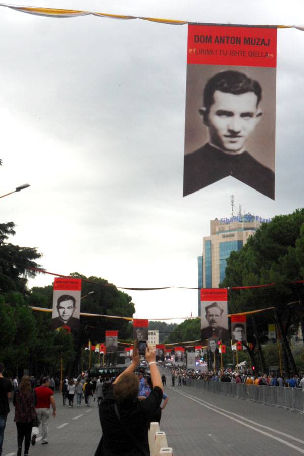 U homiliji, papa je ovu zemlju nazvao mučeničkom. Uzduž široke aleje kojom je papa prolazio do zgrade predsjednika i samog trga, bile su postavljene slike 40-ak katoličkih albanskih mučenika, uglavnom svećenika i redovnika – među kojima je i stric naše sestre Ljilje Muzić, te vjernika muslimanske i pravoslavne vjere, među kojima je jedna žena, neopisivo okrutno mučena.