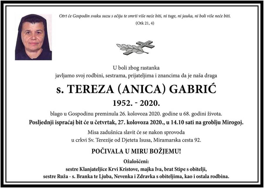 Gospodin je pozvao k sebi našu dragu sestru Terezu Gabrić nakon vremena bolesti i patnje, u ranim jutarnjim satima 26. kolovoza 2020.