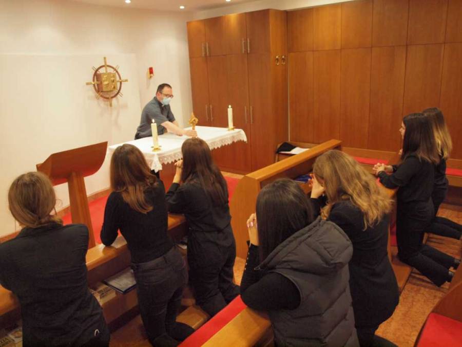 Relikvija zaštitnika i naslovnika škole koju je zadarskom nadbiskupu darovao kardinal Stanislav Dziwisz tijekom blagdana bila je na oltaru u školskoj kapeli Sv. Josipa koju su od ranog jutra pohodili učenici u grupama, svih osam razrednih odjeljenja škole. Učenici su bili u osobnoj i zajedničkoj molitvi pred relikvijom, moleći Litanije sv. Ivana Pavla II. u zajedništvu s duhovnikom škole, don Tomislavom Dubinkom. Učenike je Dubinko na kraju molitve blagoslovio relikvijom. Zadnja grupa molitelja pred relikvijom bili su profesori i djelatnici škole. S njima je molitvu predmolio i relikvijom ih je blagoslovio mons. Josip Lenkić, generalni vikar Zadarske nadbiskupije.