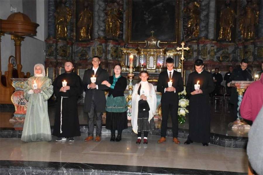 Zajednički program započeo je službom svjetla. Mladi koji su prestavljali svijeće uz prigodnu su meditaciju zapalili svoje svijeće na Uskrsnoj svijeći i podijelili plamen mladima i sudionicima slavlja u katedrali. Meditacija je otvarala prostor za razmišljanje o tome tko su sveci, tko je pozvan i kako se postaje svet: „Svi smo pozvani biti sveti, živjeti u ljubavi oko svojih bližnjih. Svet je onaj koji svaki trenutak živi život na izvanredan način. Gospodin nam udjeljuje tu milost, da dijeli svoj život s našim krhkim životom. Sami za sebe ne možemo biti sveti, već za drugoga i s drugima.“