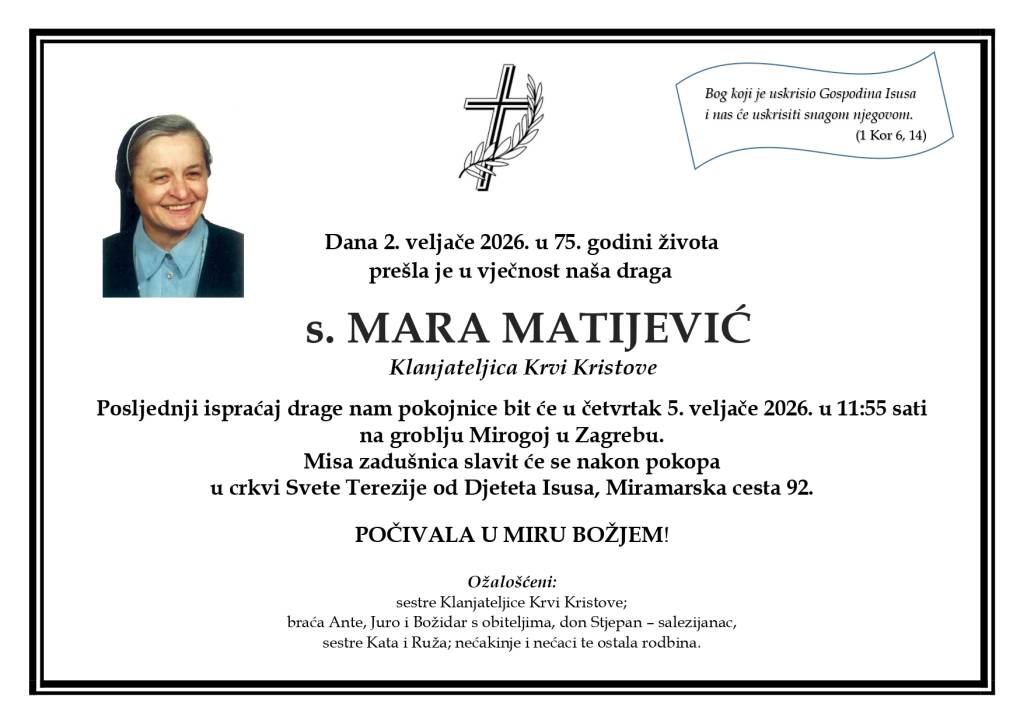 Posljednji ispraćaj drage nam pokojnice bit će u četvrtak 5. veljače 2026. u 11:55 sati